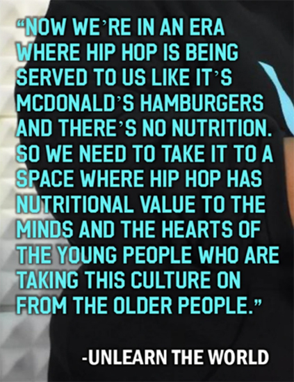 “Şu anda, hip hop’un bize sanki McDonald’s hamburgerleri gibi sunulduğu ve hiçbir besin değeri taşımadığı bir dönemdeyiz. Kültürü büyüklerinden devralan gençlerin zihinleri ve kalpleri için hip hop’u besin değeri taşıyan yeni bir alana taşımamız gerekiyor.” –UNLEARN