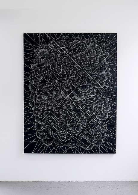 Né en 1978, Julien Brunet développe une pratique multiple : peintures, dessins, livres, vidéos. Entre des sources issues de la bande dessinée et des mangas et une grande tradition picturale, ses dessins et vidéos visent cette même recherche d’une surface absolument vibrante. Réalisés patiemment à l’encre, à l’aide d’une multitude de points faits au rotring, les dessins se construisent dans une durée lente. La surface apparaît par déplacements graduels de la main sur une même feuille ; une présence du corps qui donne à ses œuvres sur papier une qualité surprenante de velours et une réelle densité de matière. Fragments de corps, végétaux, minéraux, rayons lumineux, figures de monstres se déploient en un magma sans solution de continuité qui évoque souvent les cadavres exquis surréalistes. Dans la lignée d’un Seurat puis d’un Polke, également, il déconstruit la vision à l’aide d’images composées sous forme de trames. Ici, le regard se situe sans cesse au cœur d’une ambiguïté entre peinture et sérigraphie, apparition et disparition de l’image étant au centre de sa recherche.