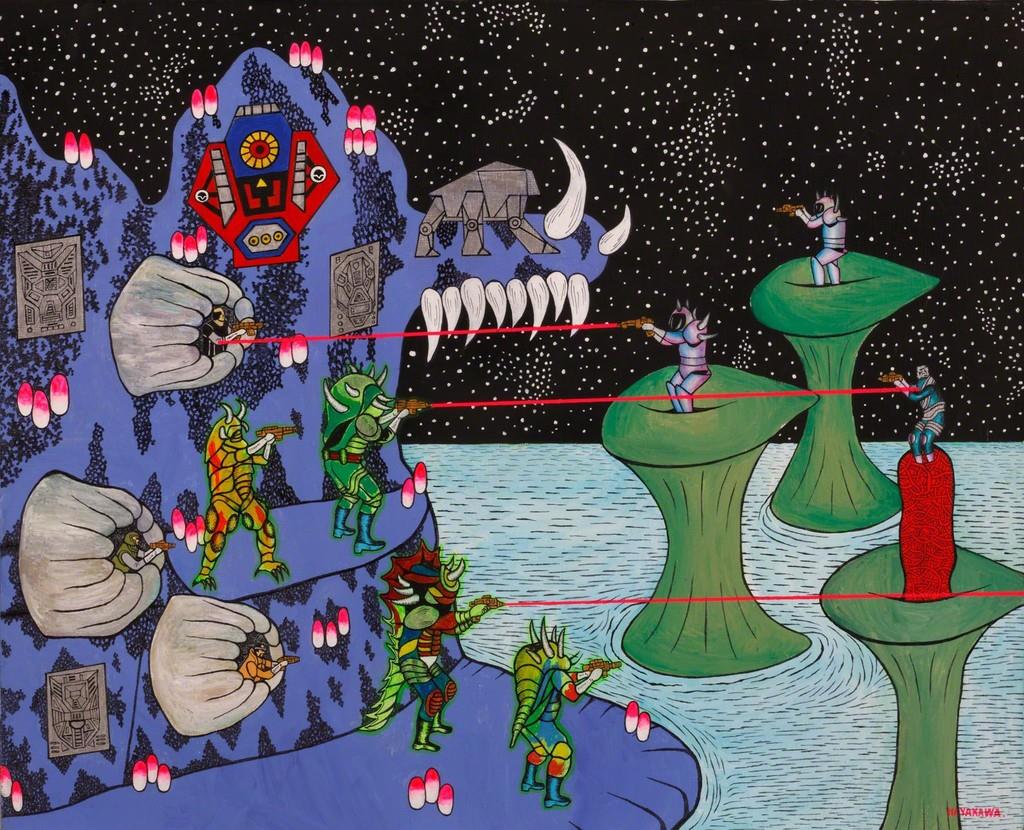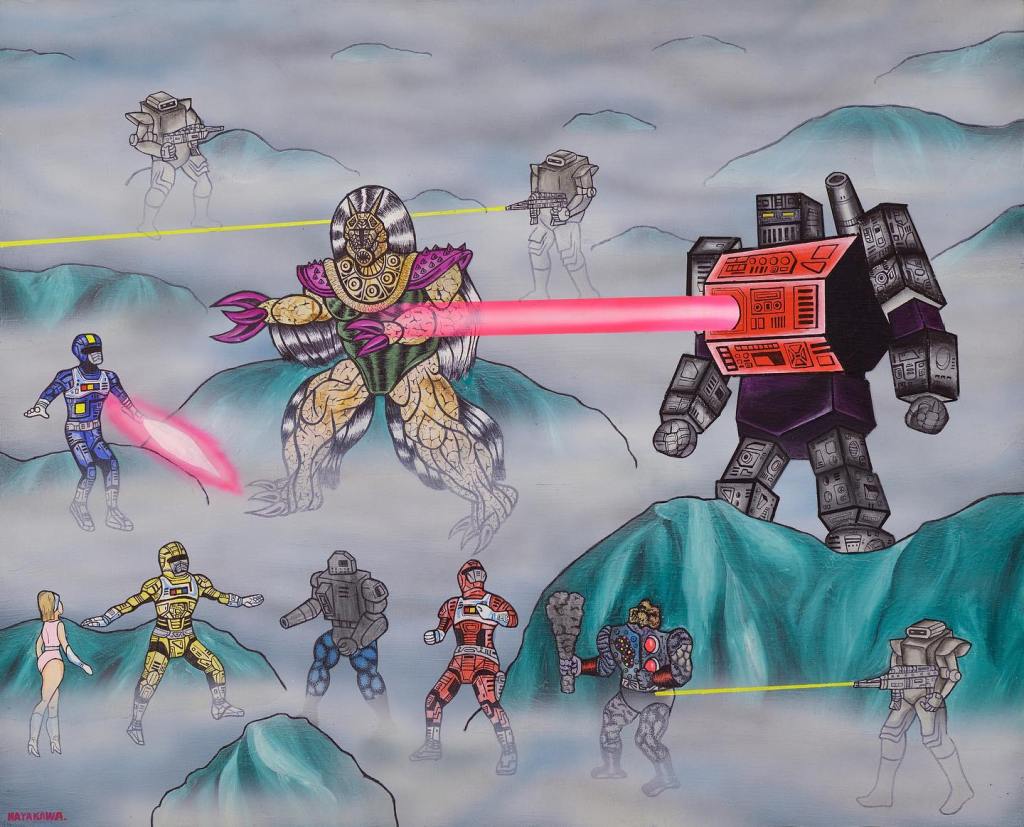 Hayakawa’nın resimlerinde uzak bir galakside yaşanan sıradışı muharebelere tanıklık ederiz. Hayatta kalmak için ölümüne savaşan yaratıklar ve robotlar izleyici açısından pek bir tehlike arz etmiyor olabilir, ama o resimleriyle birlikte, bizlere kimsenin kolay kolay ayak basamayacağı bu diyarlara yolculuk ettiğini açıkça ispatlıyor.