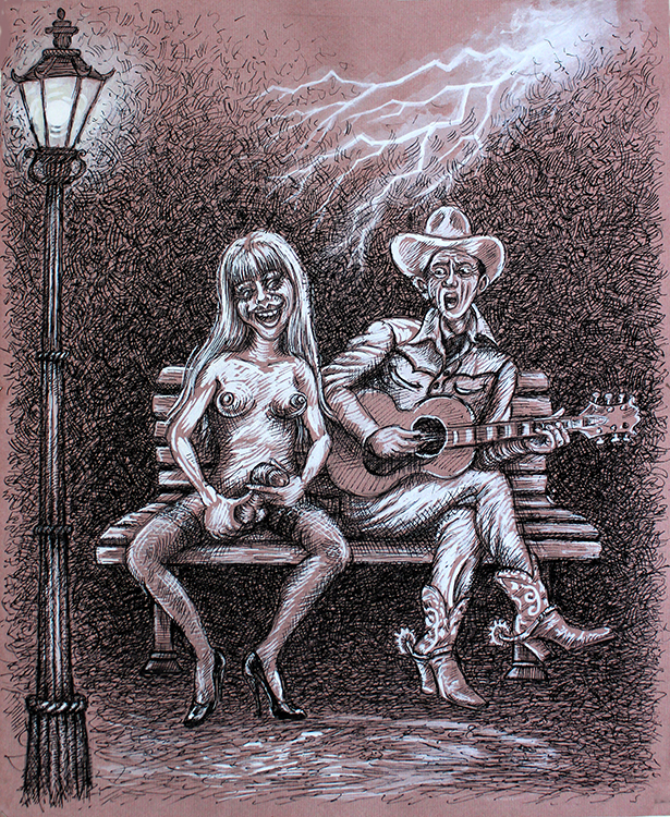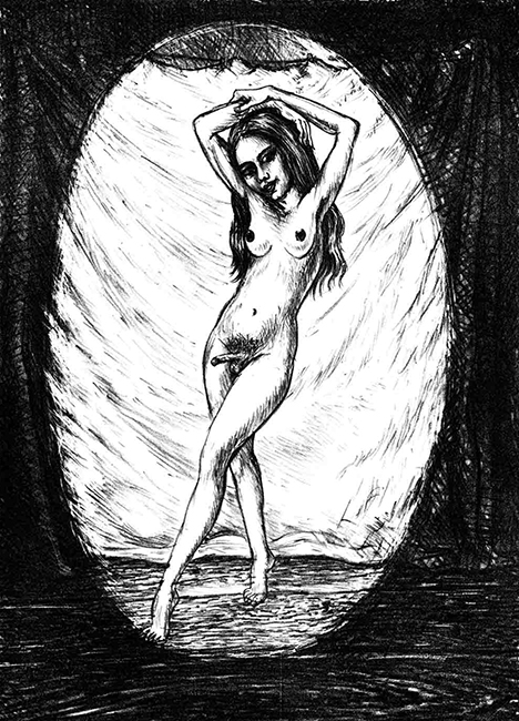 Obwohl, einmal gestand mir eine Frau, die ich damals sehr begehrte, dass sie gerne einen Schwanz hätte. Also erbot ich mich sie mit einem solchen zu malen. Das tat ich dann auch. Aber so richtig begann ich damit erst, als ich mit Mitte 50, gelangweilt von meinem immer gleichen alten Selbst, beschloss die Wechseljahre zu nutzen und ein zweites Leben als Mädchen zu beginnen. Nur auf mein wertvollstes Teil verzichten wollte ich dabei doch nicht. Erst machte ich nur ein paar Fotos und und Videos von ihr, ganz schlicht und trashig, nur zu meiner Unterhaltung. Entwarf dann in schlechtem Englisch eine kurze Biografie für das Mädchen, um so vielleicht ein „Second Live“ auch im Internet zu beginnen. Als ich 2011 vom „Museum of Porn in Art“ in Zürich für eine Ausstellung eingeladen wurde begann ich dafür die Geschichten der beiden in einer Serie von Tuschezeichnungen zu illustrieren. Anders als ich hat das Mädel sogar eine Philosophie, hier ein kurzer Auszug: