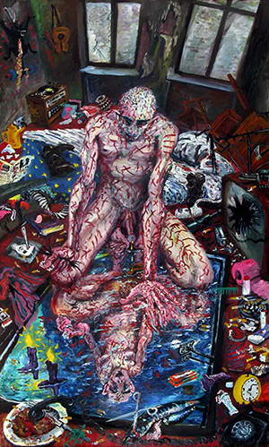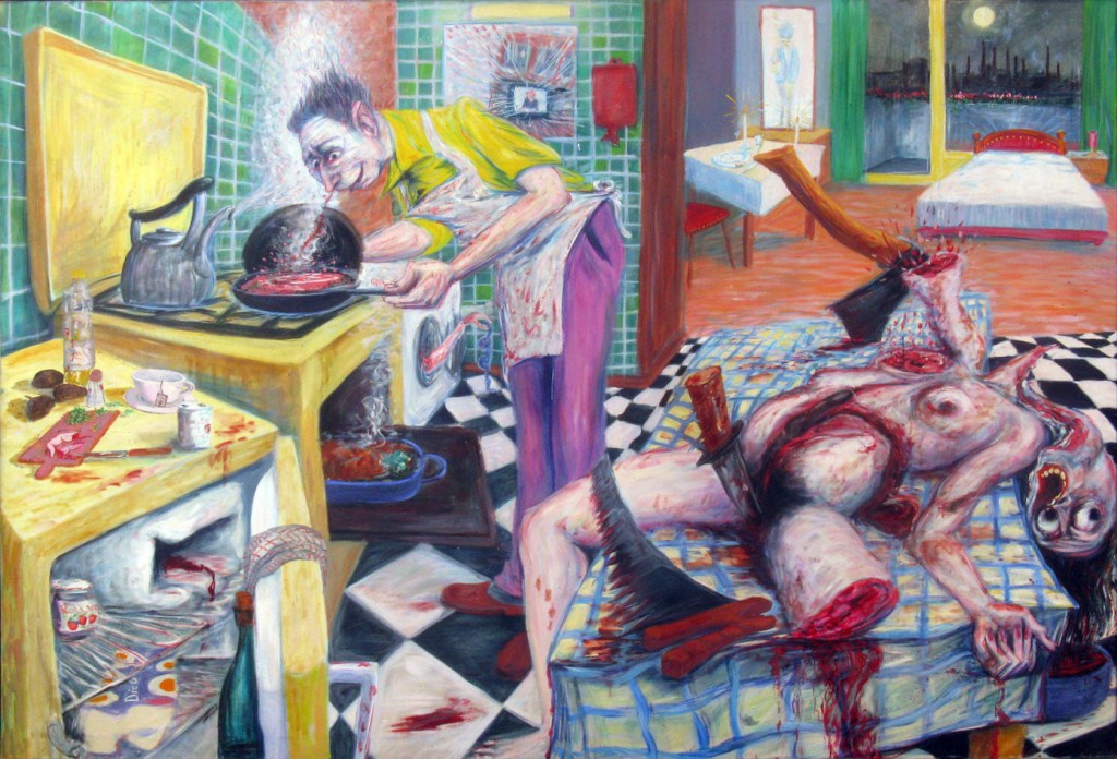 Ende der Siebziger, Anfang Achtziger entstehen meist großformatige Leinwände in zeitgemäß wildem Duktus, doch seine Arbeiten unterscheiden sich grundlegend von den verhuscht dahingepinselten Flachheiten der „Moritzboys”. Wie viele Künstler ist er fasziniert von der radikalen Konsequenz des Verbrechers, dem bewussten Verstoß gegen die bürgerliche Moral. Das Abgründige, Abwegige, Albtraumhafte, “das schrecklich Schöne der Tat” (Nietzsche) sind bei weitem ergiebiger als das Schöne, Wahre, Gute. Die Niederungen der menschlichen Existenz werden hier ausgelotet, es geht stets sofort zur Sache. Rohe Gewalt beherrscht die Szenerie. Die Täter sind Ärzte, Polizisten, Lustmörder, Punks , Skinheads, scheißende Köter. Der verrückt gewordene Spießer von nebenan – er löscht gerade seine Familie systematisch aus. Riesenweiber, die sich an ihren mickrigen Männlein austoben. Perverse, die Hand an sich legen und legen lassen. Ein nettes Pandaimonion der Neuzeit wird sarkastisch mit viel Liebe auf dem Präsentierteller gereicht.