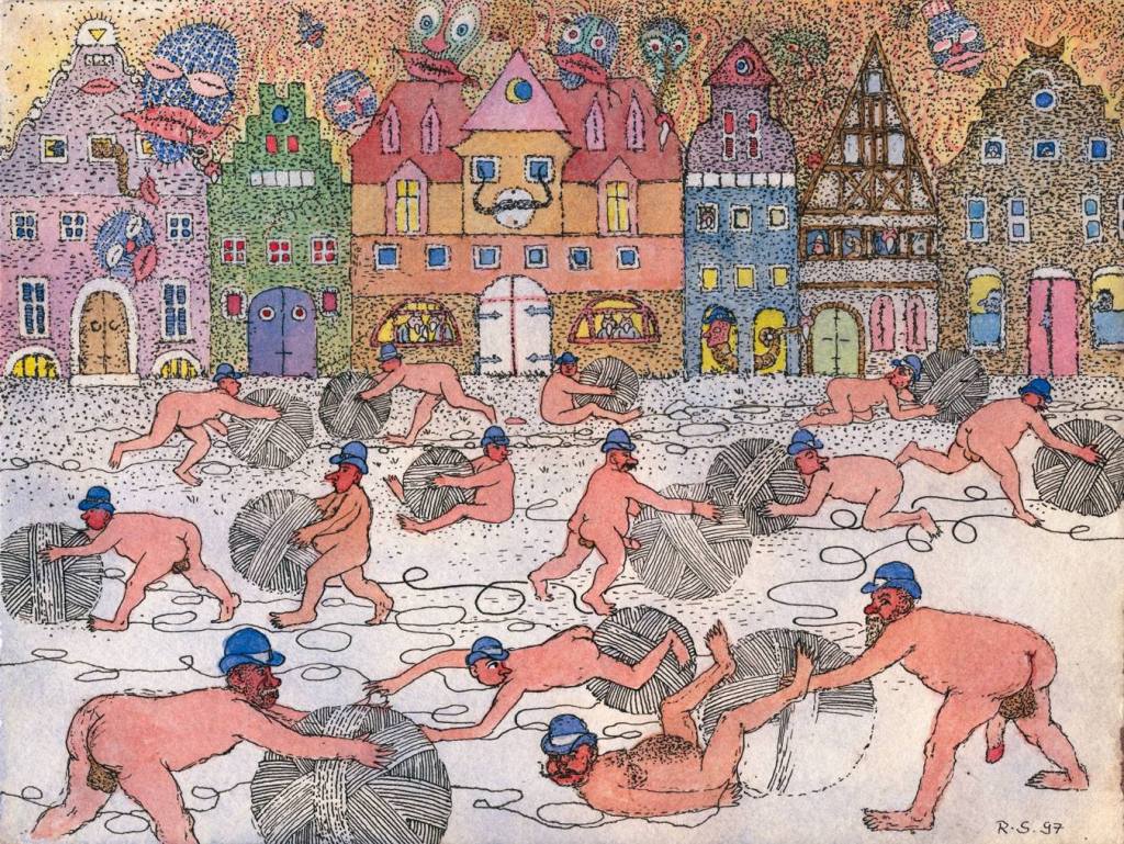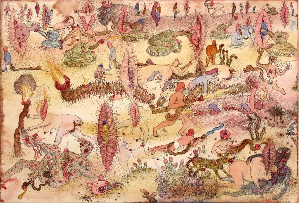 Mais quelque chose de nouveau fait son apparition. La vision de Scheibner se distancie et il découvre la flore. Tout d’un coup il y a de l’herbe, des arbres et des paysages soignés, une certaine forme d’approbation s’insinue. Bon, à l’arrière-plan, on continue de s’entretuer, de profaner et de mettre le feu. Scheibner est touché par la réalité, mais ne s’en étonne plus, il trouve toutes ces imbécillités terrestres plus amusantes que tragiques. On s’imagine complice de son humour ou bien on le réfute car on le trouve trop répugnant : devant Scheibner comme devant tout grand artiste, toute prise de position est extrême. Il donne un souffle de vie à ces visages-culs qui chient les aliments digérés par leur bouche en forme de rosette : oui, ils ont des physionomies humaines et soudain ils se mettent à vivre.
