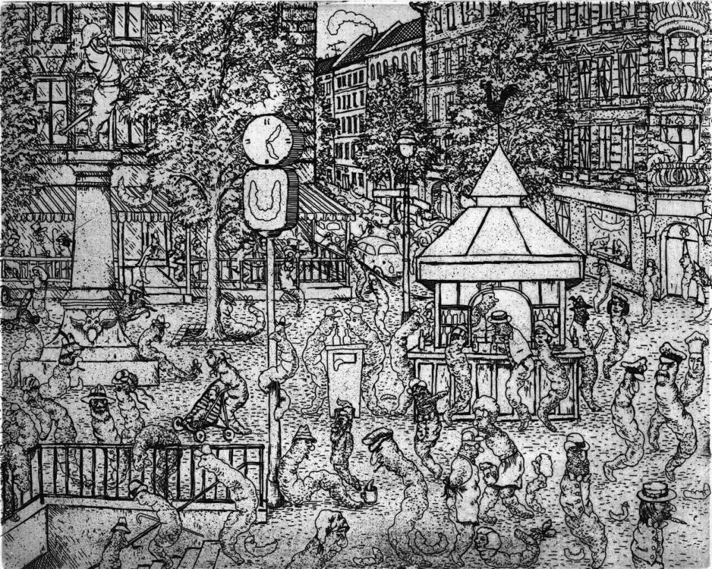 Depuis l’élimination de l’intelligence juive, les gratte-papiers et curateurs allemands ne sont plus que des manœuvres au service de ce rapace qu’est le marché de l’art. Depuis lors, ils ont d’extrêmes difficultés devant des tableaux qui osent passer la frontière de la caricature ou de la bande dessinée : Au pays des poètes et penseurs, l’Art sublime est tenu de rester sérieux, et la caricature n’a rien à voir là-dedans, basta ! Interdiction de rire. Evidemment, qui est trop sérieux – et malheureusement, les Germains le sont – n’a aucune raison de rire. Ces hydrocéphales donnent leur préférence aux migraines plutôt qu’à l’humour libérateur. Que cette façon de penser soit absurde, obstinée et auto-cas-tratrice, ce n’est pas ici notre sujet. Sans humour il n’y aurait ni Plautus, ni Rabelais, ni Jarry, ni Rops, ni Ensor, ni Grosz, ni Crumb etc. En Germanie, un Robert Combas ou un Hervé di Rosa seraient obligés de faire la queue pour le R.M.I.