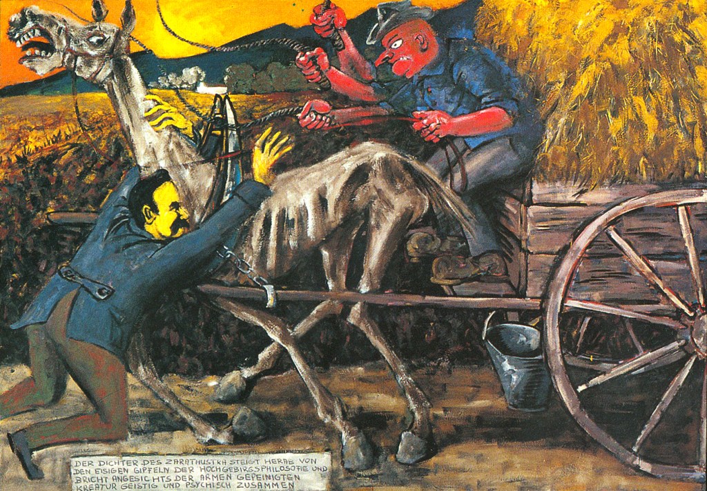 C’est l’époque des squatts et des bagarres de rue. Quand les policiers ne sont plus là, on se démolit respectivement la gueule dans des bistrots. Les policiers et les autonomes se ressemblent de plus en plus par leur apparence et leur comportement ; Qui est l’auteur ? qui la victime ? La folie est omniprésente, on la ressent presque physiquement dans la ville de la guerre froide. Reagan, rendu idiot bien avant sa maladie d’Alzheimer, médite tout haut sur les bénéfices à gagner d’une guerre atomique (first-strike-capability !), 1984 est planté devant la porte, le Horla passe en courant. No future – de chaque trou sortent des gémissements. Puis Tschernobyl se met à trop bouillir, à déborder, et c’est le cirque complet. Comme toujours, on ne peut surpasser la réalité. Scheibner essaie seulement de s’en approcher, de la comprendre par son art. De là l’attachement aux détails méticuleux, l’abondance baroque d’objets et de personnages qui fourmillent dans la plupart de ses œuvres. Il raconte des histoires de grandes villes, documente le stress des soldes de fin de saison, l’isolement de l’individu dans la masse, les hurlements dans les distilleries, la confusion dans les rues ; l’architecture est répugnante, inhumaine, monstrueuse et menaçante ; la nature n’existe pratiquement pas, tout au plus y fait-il allusion. Aux représentations du quotidien s’ajoutent en 1991 – pendant I’ ” Opération Désert Shield ” – des images de batailles avec des tanks, des fusées ” scuds ” et des soldats qui portent des masques à gaz : Scheibner reste comme toujours proche de l’actualité. C’est à cette époque qu’il compose un fantastique tableau sur l’effondrement de Nietzsche à Turin. On reconnaît dans la caricature du cocher qui fouette le cheval les traits du visage de Scheibner. Rouge de fureur, il frappe la pauvre créature squelet-tique et sans défenses. Bien qu’il s’identifie aussi au philosophe devenu fou, il est à la fois auteur et victime, donc pas meilleur que les salauds qu’il représente : Lui-même n’est qu’un salaud parmi des milliards de cinglés, et chacun s’imagine devoir trotter à la poursuite d’un présumé but vital. Ils ne sont tous que des sacs de sang remplis de merde, mis en mouvement par le fouet de leur caducité biologique, obsédés par le désir de détruire les autres avant que ne vienne leur tour.