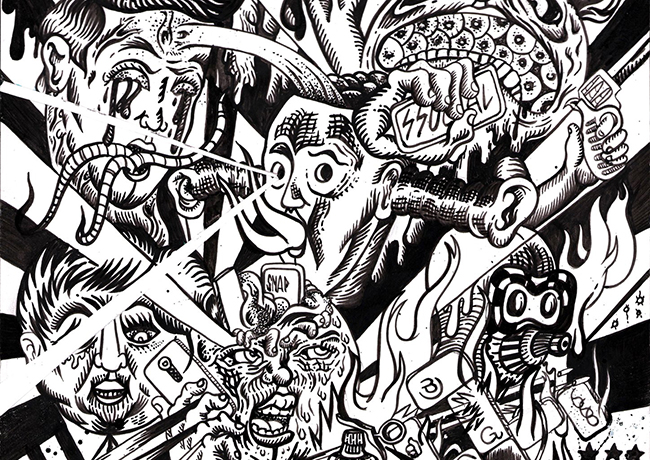 Returns to drawing in 2016 by working on the exhibition “Printnoiz” of Le Dernier Cri, in Marseille. There follow years of graphic meetings and multiple collaborations for collective editions: