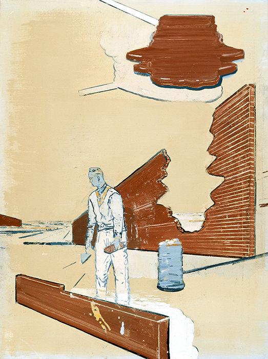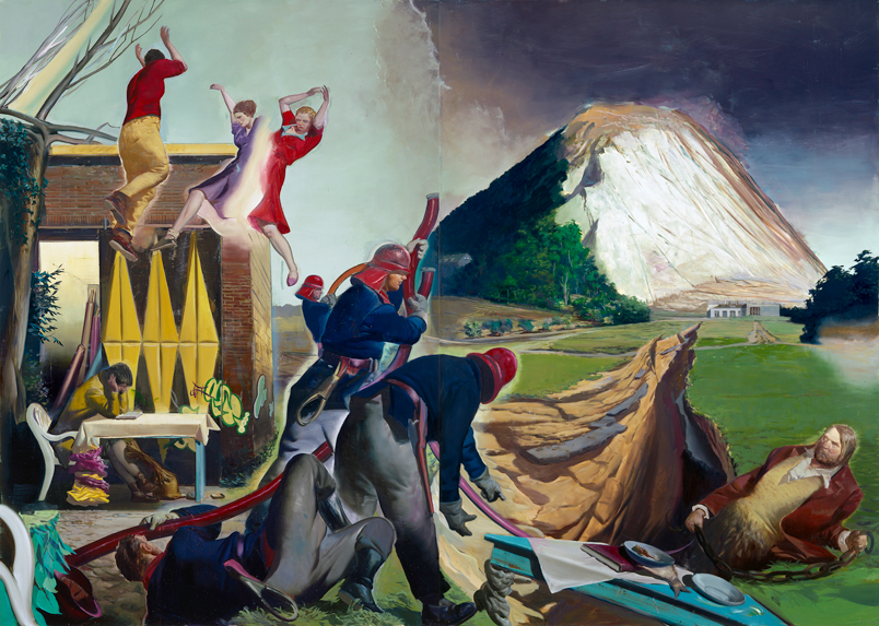 Rauch’s paintings suggest a narrative intent but, as art historian Charlotte Mullins explains, closer scrutiny immediately presents the viewer with enigmas: “Architectural elements peter out; men in uniform from throughout history intimidate men and women from other centuries; great struggles occur but their reason is never apparent; styles change at a whim.”