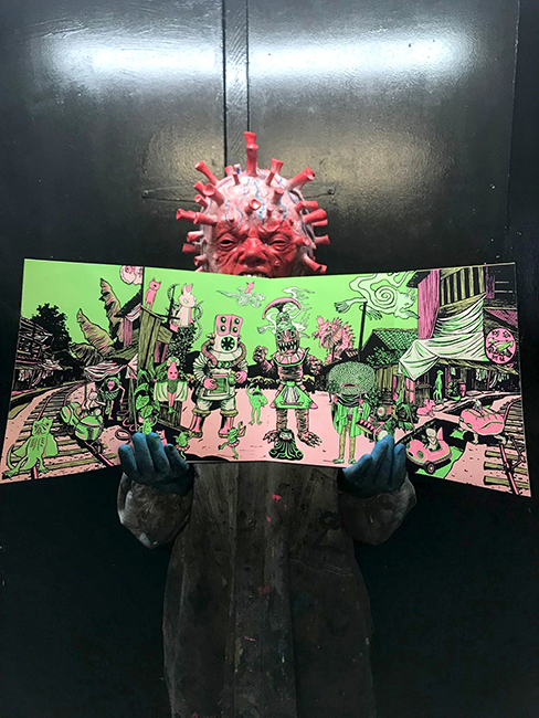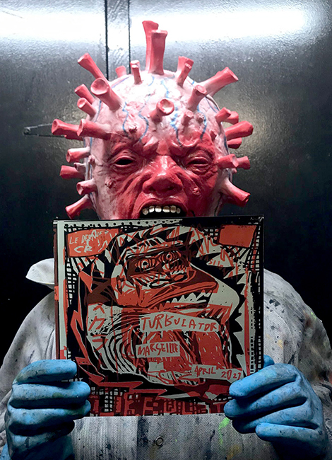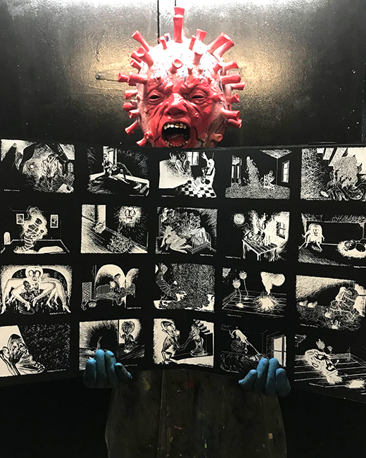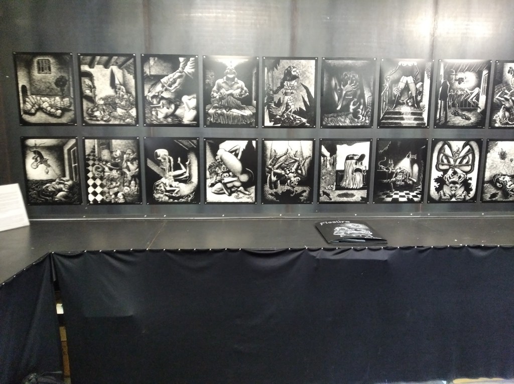 Pour retranscrire ce rêve récurrent, j’ai d’abord réalisé une série de 25 dessins automatique où j’ai laissé errer ma plume au gré de mon inconscient, un trait amenant un autre, un dessin appelant le suivant. Ces encres m’ont servi de base pour les vingt grands dessins en carte à gratter que j’ai dessinés par la suite et qui m’ont pris pas moins de trois ans à réaliser : au vu du format plutôt grand pour cette technique longue et exigeante qu’est la carte à gratter, chaque dessin me prenait à peu près trois semaines pour les finir et pour donner vie aux personnages étranges qui les habitent. Véhicules de mon exorcisme.