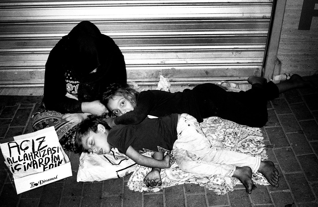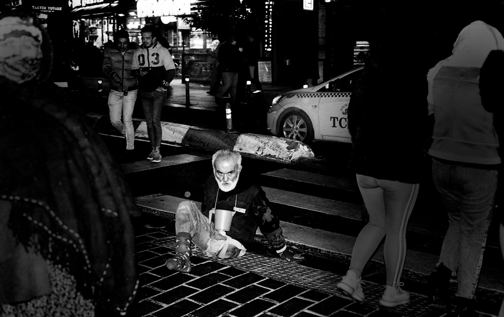 After my first two visits to Istanbul in September and November 2019, it was clear to me that my visual output would amount to a photobook. But with the outbreak of corona and a new dimension of existential pressure on the health and economics of its citizens I decided to go back. It was December 2021, the city was blessed with a soft and pleasant glow of winter sunlight and on the surface, you couldn’t detect any changes of spirit. However, roaming around the city at night the increasing level of misery was more than apparent. It was shocking to see how many seemingly unattended children, were begging in the middle of overcrowded streets, facing for hours thousands of unanimous legs and feet. Beggars exposing their amputated limbs, homeless families sleeping in drifty doorways or cardboard boxes. Old women and men groaning and whining for a modest aid.