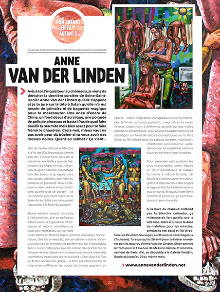 Avis à toi, inquisiteur au chômedu, je viens de dénicher la dernière sorcière de Seine Saint Denis ! Anne Van der Linden qu’elle s’appelle et je te jure sur la tête à Satan qu’elle n’a nul besoin de grimoire ni de baguette magique pour te marabouter. Une once d’encre de Chine, un fond de jus d’acrylique, une poignée de poils de pinceaux et basta ! Pas de quoi faire bouillir la marmite mais bien assez pour te faire frémir le chaudron. Crois moi, mieux vaut ne pas avoir peur du bûcher si tu veux avoir des messes noires. Quant au Sabbat ? Ben, ça vient…