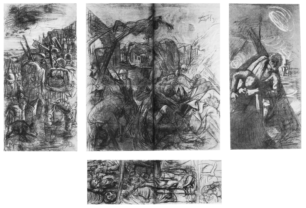 1924 yılında baskılarına başladığı savaş resimlemelerinin tüm sonucunu; belleğindeki, rüyalanndaki, not defterlerindeki anılarına eşlik eden, o dönemde yayımlanmış belgeler ve fotoğraflardan da yararlanarak ünlü üçlemesinde evrensel bir mesaja dönüştürdü.