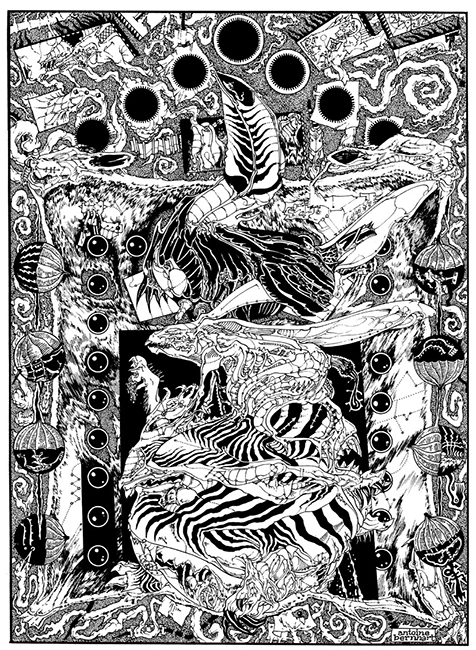Pour commencer, on m’identifie beaucoup comme un bédéiste. Mais je fais aussi de la peinture, qui n’est pas vraiment de la peinture en réalité, en tout cas au sens classique de la peinture avec pinceau et toile. Ma BD, elle se rapproche souvent de Bosch plus que de Gotlib. Et puis je fais aussi de la musique, mais je ne me considère pas non plus comme un musicien. Je fais des collages musicaux. Je suis un peu dans ce qu’on appelle le Dark Ambiant. Ça donne des ambiances, souvent smooth, bizarroïdes, étranges, toujours anxiogènes. J’ai une identité qui est Henriette Valium, et j’en ai une autre comme colleur musical, c’est Laure Phelin. En fait, c’est le nom que j’aurais voulu avoir comme bédéiste, mais il était trop tard. Parce que pour mon nom, j’ai été baptisé. C’est quelqu’un qui m’a dit : appelle-toi Henriette Valium…