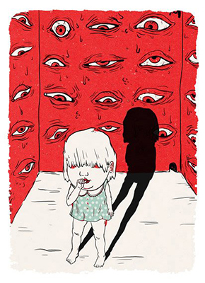 At this point, two names, sharing a similar visual and thematic universe in fareastern and western cultures, with Varol Ergen emerge: Toshio Saeki and Trevor Brown. Toshio Saeki has achieved local / folkloric works, settling up with fareastern traditions and including anomalous sexualities / amorphous figures. Ergen, on the other hand, strips, the dark and suppressed truths of the country she lives in, of geography and finally narrates, having reached a conventional language. Trevor Brown also produces works handling child abuse, with a very hard language, but by fetishizing it. Elif Varol Ergen, on the other hand, does not benefit from the defenceless state of the children, does not show them as chocolate boxes, lollipops; she transforms them to her works on a more merciless level of reality, without equivocations, deforming and “making ugly” when required. Because, Ergen’s children have devolved far earlier than required into the dark world of adulthood; their dirty, bloody clothes; their bodies having gone through metamorphosis do not surprise us. Ergen takes us first into the “simple happiness moment”s of childhood, then into the irreversible, twisted / hurt moments. Yes, maybe we are smiling together with “The Princess” at the bottom of the pit, but soon a bitter smile on our faces and the acrid taste of “red” on our tongues settle down.