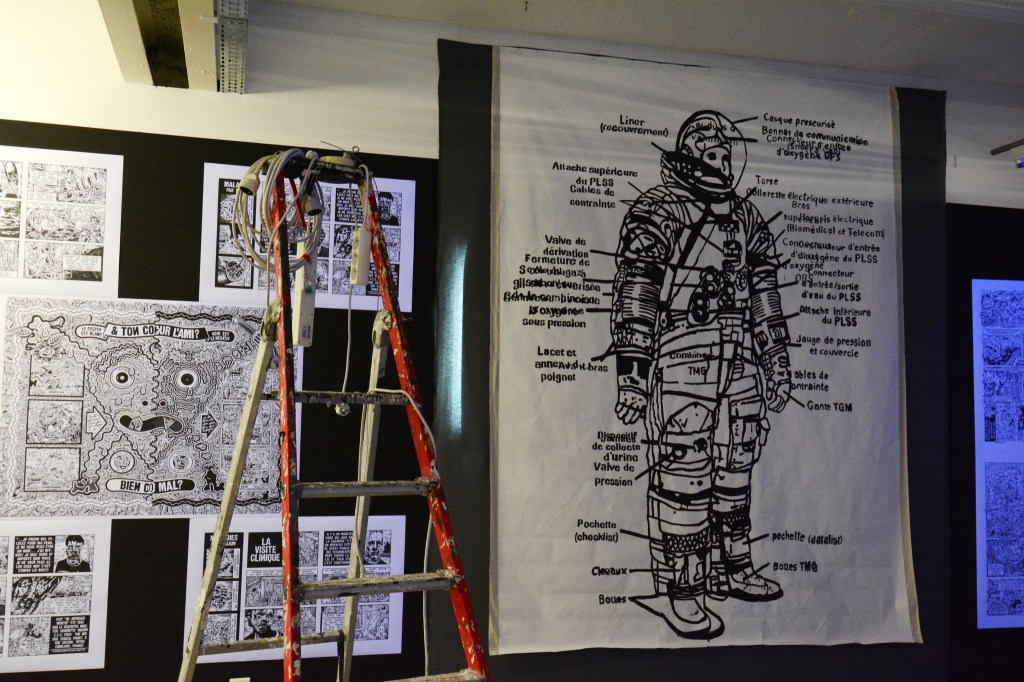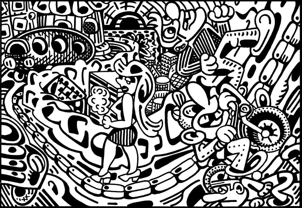 De ces collages qui font « saigner des yeux » pour reprendre le tendre vocabulaire de Pakito, un dialogue de sourd va se créer entre les deux artistes. Pakito et Boujiki foncent chacun de leur côté et têtes baissées dans une interprétation dessinée des collages originels. D’un côté, on découvre le dessin noir, nerveux et habile d’un Pakito nourri au Bazooka davantage connu comme éditeur et sérigraphe et de l’autre l’impressionnant trait brut de Boujiki qui vient déconstruire au plus haut degré tout ce qu’il va absorber par les yeux. C’est alors que dans un dernier cri jubilatoire, Pakito va venir amalgamer en sérigraphie ces deux visions brutales et incroyablement puissantes.