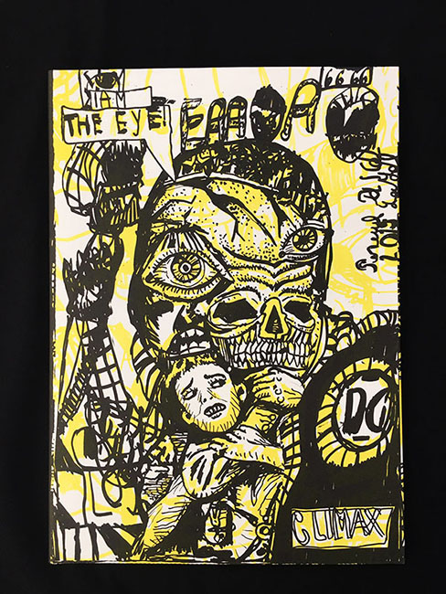 I’m the Eye Climax or the graphic pile-up of two off-track creators. Pakito Bolino, underground publishing figure and creator of Dernier Cri, and Pascal Leyder aka Boujiki, resident artist at S Grand Atelier, an art center for the mentally handicapped. A surprising King Size graphzine (A3 format) with a dark black and bright yellow cover! It’s the forceps birth of this improbable but successful encounter between dripping creatures, Z-series typography and naked women. A spontaneous graphic work reminiscent of the principles of the exquisite corpse and the Arab telephone combined. A palpable 666th degree and an edition that will delight fans of graphic sensations and perhaps even wake the dead. (resource: sterput.org)