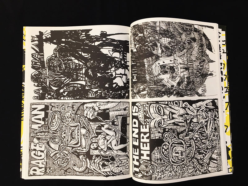 L’édition de 120 pages en format A3 présente le travail dans toutes les étapes de son processus mais dans le désordre puisque c’est le leitmotiv de cette rencontre ! Une déconstruction à la fois spontanée et progressive d’une imagerie déjà digérée et surtout la révélation d’un combo magique entre art brut contemporain et graphisme punk underground.